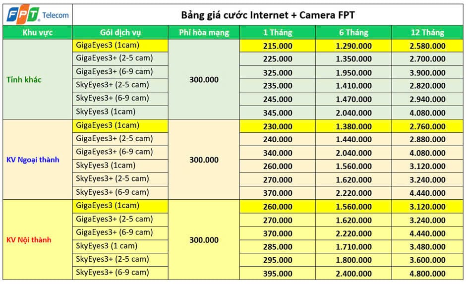 BẢNG GIÁ COMBO INTERNET + CAMERA FPT