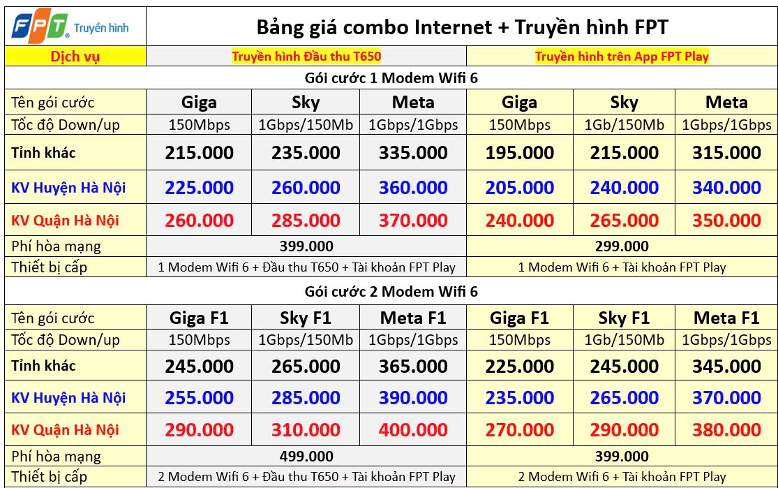* Gói cước 1 thiết bị wifi: 1 Modem Wifi 6 Băng tần kép 2.4Ghz và 5.0 Ghz + 1 Đầu thu FPT PLay