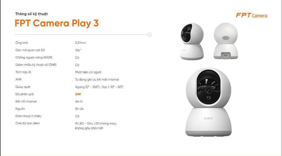 • FPT Camera Play 3 là dòng thiết bị FPT Camera chuyên dụng để lắp đặt trong nhà với chuẩn hình ảnh 3MP. Góc xoay ngang 355 độ và xoay dọc -10 độ -50 độ bao quát toàn diện. Hỗ trợ đàm thoại 2 chiều tiện lợi.FPT Camera IQ3S là dòng thiết bị FPT Camera chuyên dụng để lắp đặt ngoài trời vừa ra mắt năm 2024. Với độ phân giải 3MP, tầm nhìn xa hồng ngoại đến 30 met, có đèn Led rọi buổi tối kèm còi hú khi phát hiện chuyển động.
